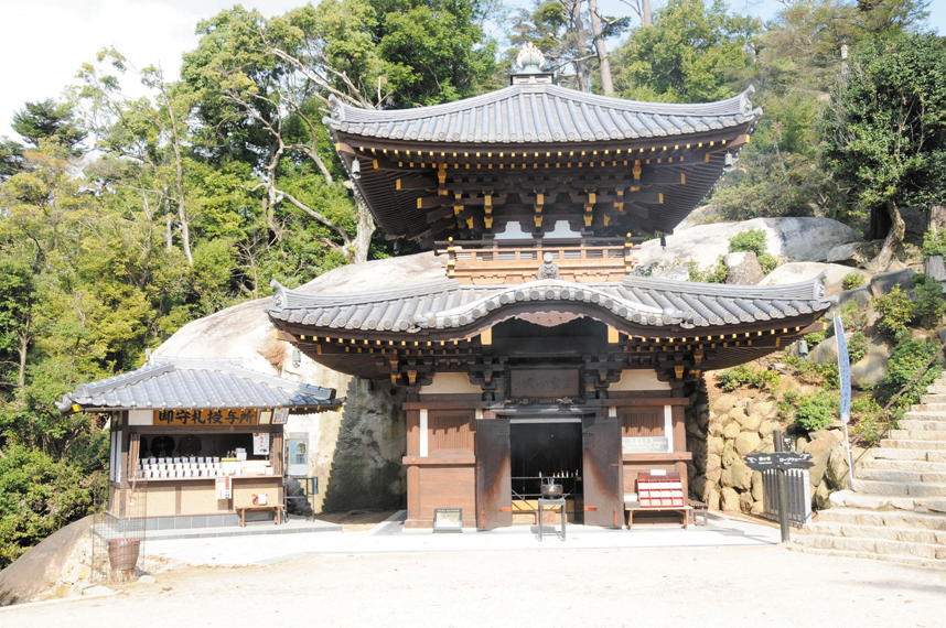 宮島ロープウエー獅子岩駅から徒歩約20分のところ、弥山本堂の目前にあります。大同元年(806年)に弘法大師が修行を行ったときの霊火が1200年以上たった今も「消えずの火」として燃え続けています。宮島・弥山”消えずの霊火堂は、もっと幸せになれるスポットとして「恋人の聖地」に認定されています。